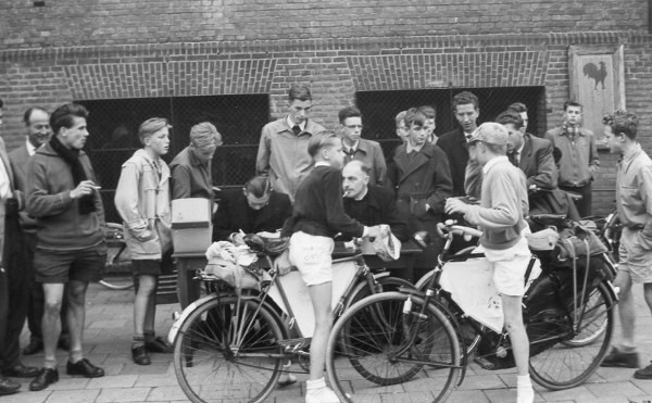 Goed voorbereid: stopwatch om de nek, van alles achterop en toch nog pech; pater Van Rijckevorsel (volgens mij) helpt een handje.