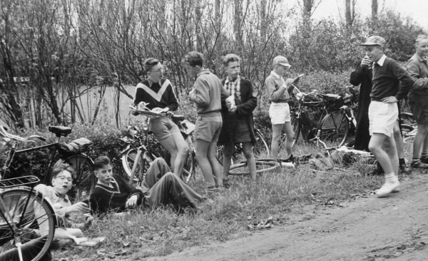 Een ploeg onderscheidt zich met hoeden op. Links probeert leraar Duncker zich een weg te banen en lijkt enigszins verstoord te kijken. Geen zin of haast om bij een post te komen?